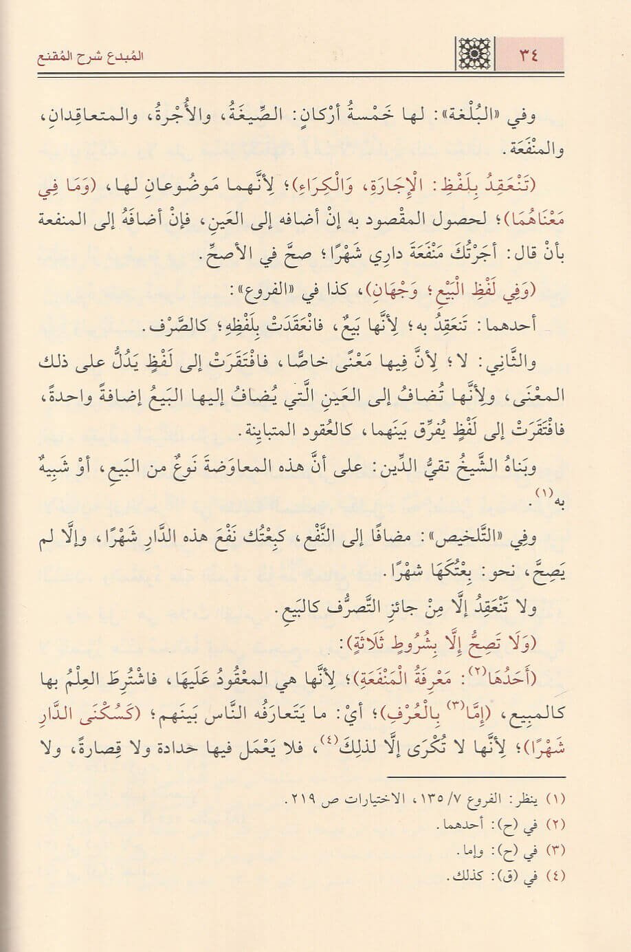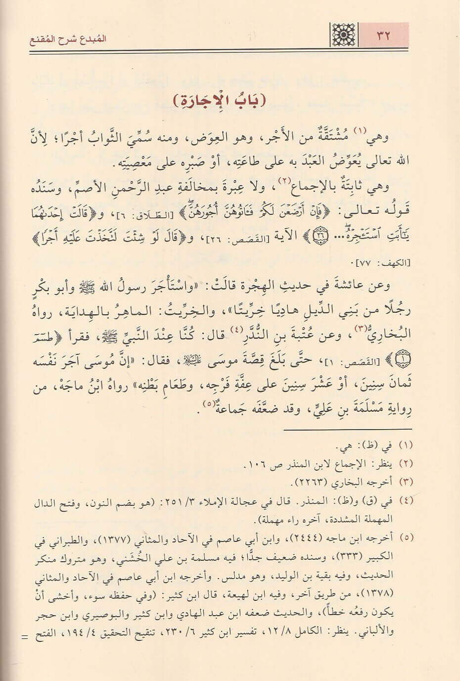 قال العلامة برهان الدين إبراهيم بن مفلح في مقدمة المبدع شرح المقنع : وكنت قرأت فيه كتاب المقنع لشيخ الإسلام العلامة موفق الدين أبي محمد عبد الله بن أحمد بن قدامة، تغمده الله برحمته وأسكنه بحبوحة جنته. وهو من أجلها تصنيفا، وأجملها ترصيفا، وأغزرها علما، وأعظمها تحريرا، وأحسنها ترتيبا وتقريرا. فتصديت لأن أشرحه شرحا يبين حقائقه، ويوضح دقائقه، ويذلل من اللفظ صعابه، ويكشف عن وجه المعاني نقابه، أُنبه فيه على ترجيح ماأطلق، وتصحيح ما أُغلق. واجتهدت في الاختصار خوف الملل والإضجار، ورسمته ب: المبدع في شرح المقنع والله أسأل أن ينفع به، ويجعله خالصاً لوجهه الكريم، إنه غفور رحيم.