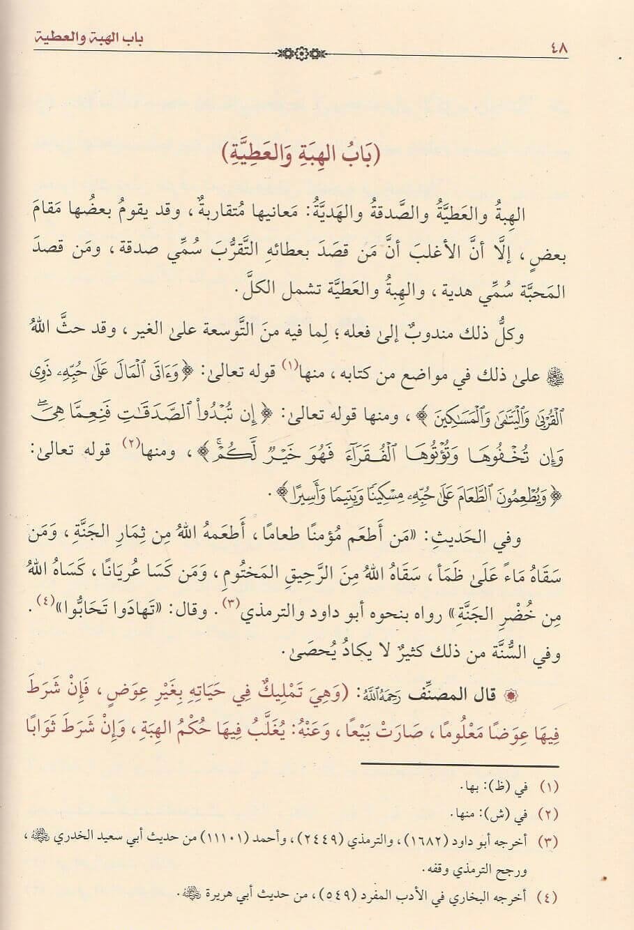 1 إدراج أدلة أحكام المسائل المذكورة في المقنع. ومن أمثلة ذلك إجزاء نضح الماء في بول الغلام الذي لم يأكل الطعام. فذكر حديث أم قيس بنت محصن الأسدية قالت: (دخلت بابنٍ لي على رسول الله ﷺ لم يأكل الطعام. فبال على ثوبه. فدعى بماءٍ فرشه عليه).