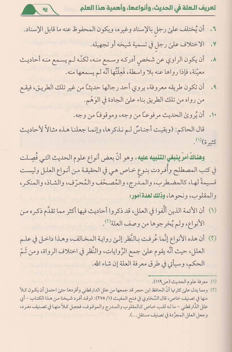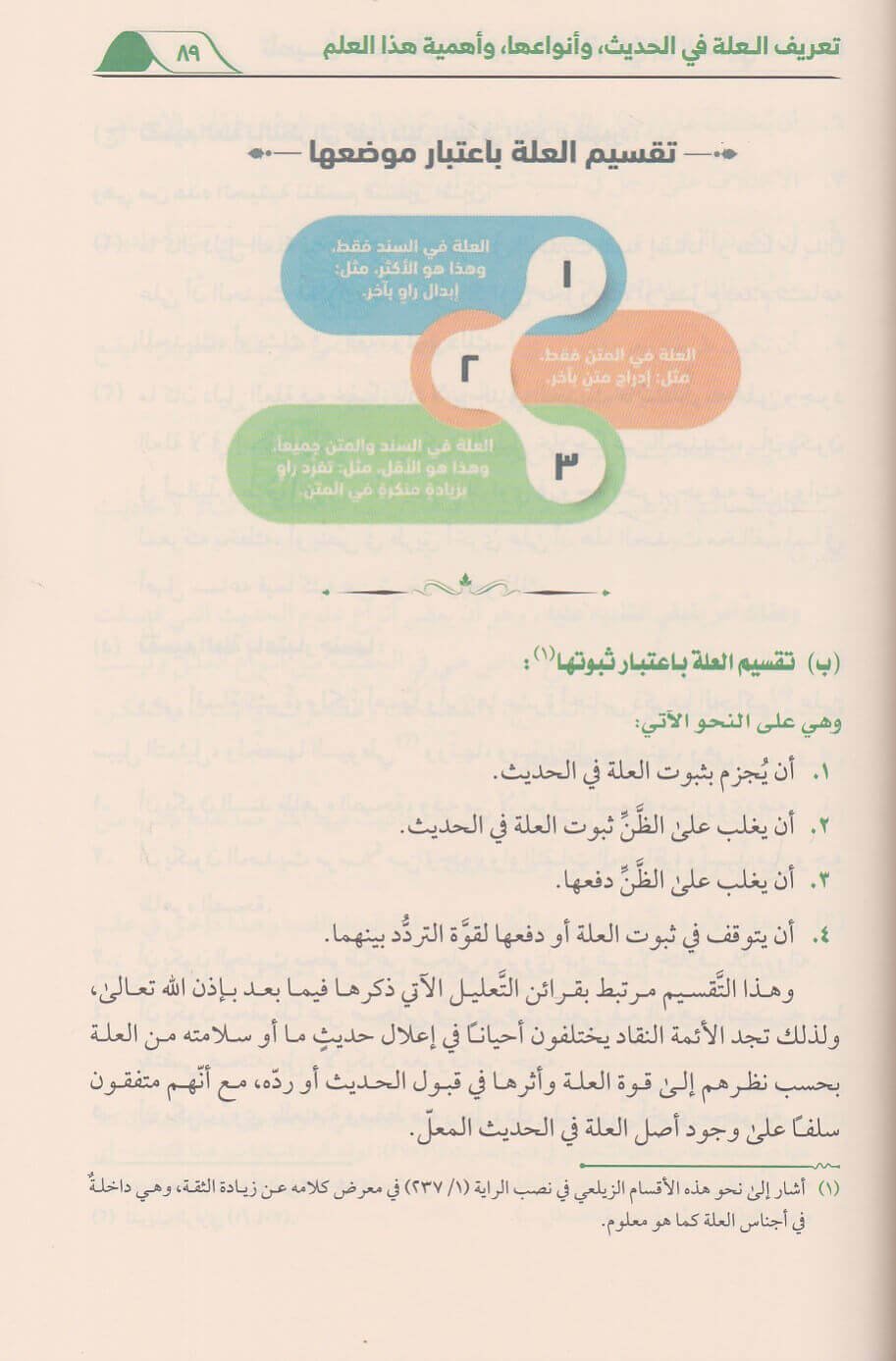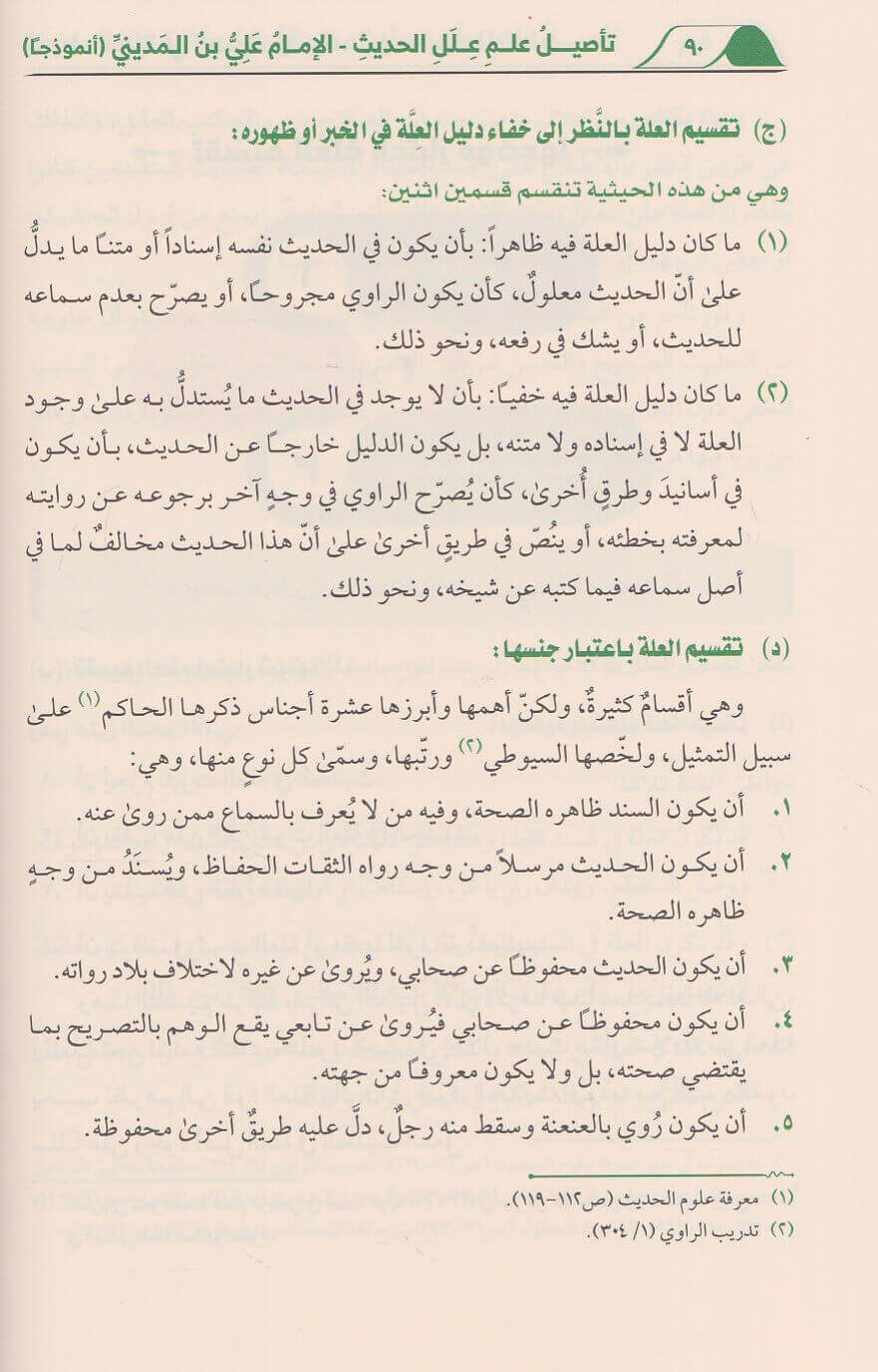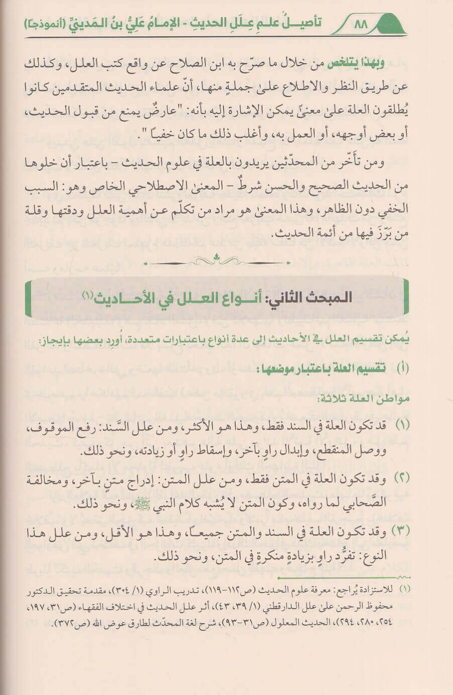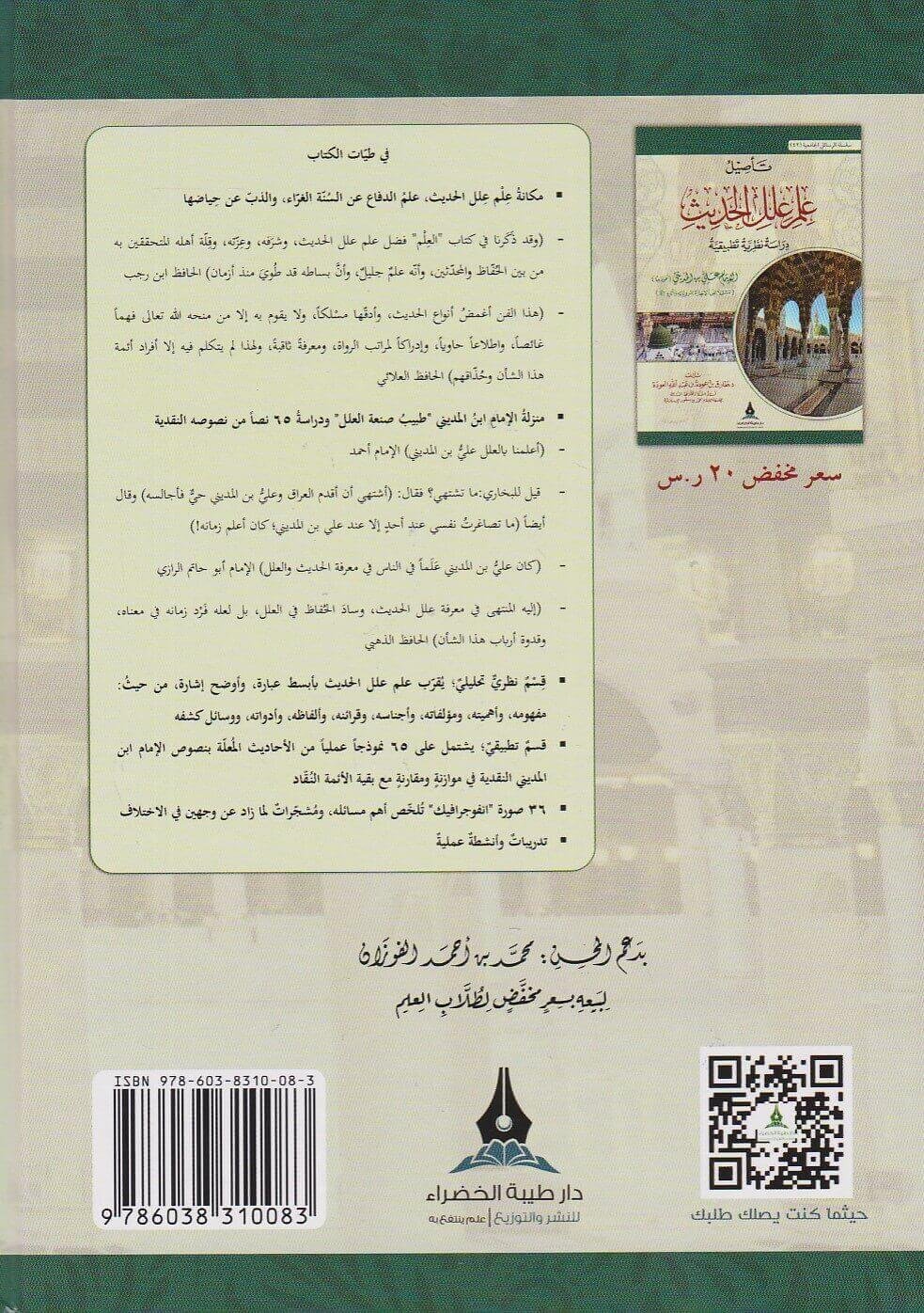 كتاب نظري تحليلي يقلرب علم علل الحديث بابسط عبارة واوضح اشارة من حيث مفهومه واهميته و مولفاته واجناسه وقرائنه والفاظه وادواته ووسائل كشف العلل. ويتناول القسم التطبيقي 65 نموذجا عمليا من الاحاديث المعلة بنصوص ابن المديني النقدية في موازنة ومقارنة مع بقية الائمة النقاد. ويحتوي الكتاب 36 صورة توضيحية تلخص اهم مسائله وكذلك مشجرات لما زاد عن وجهين في الاختلاف وهناك تدريبات وانشطة علمية