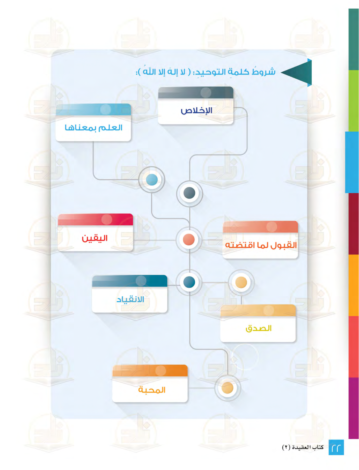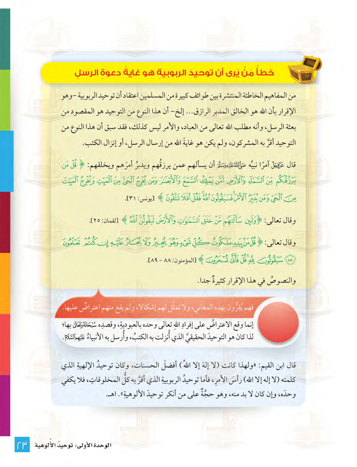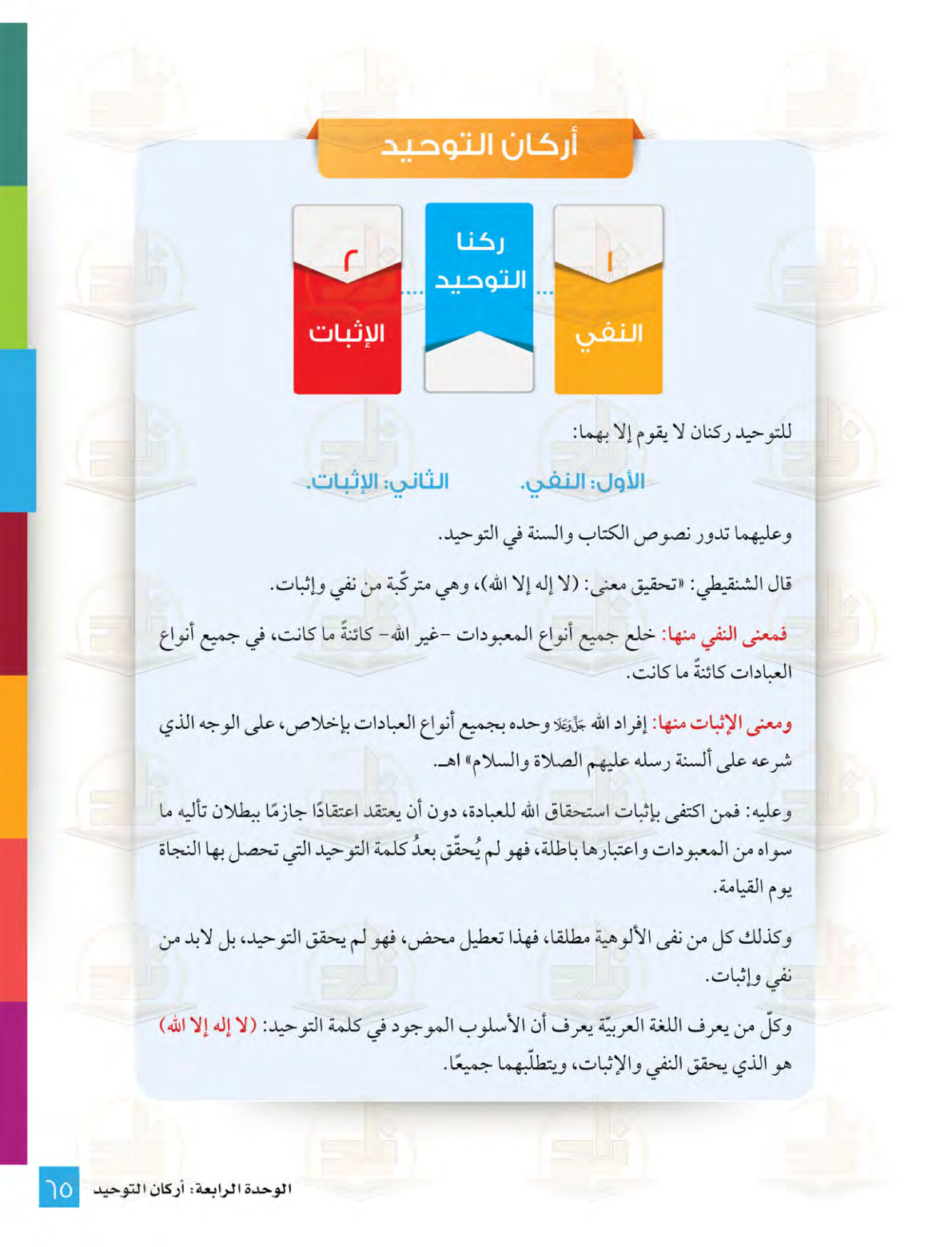 - من كتاب العقيدة: توحيد الألوهية وأدلته، ومعنى لا إله إلا الله، والعبادة وأركانها، وتوحيد الأسماء والصفات، وأقسام الناس فيها، والإلحاد فيها ومعناها وقواعدها وقواعد التعامل معها، وثمرات الإيمان بالأسماء والصفات