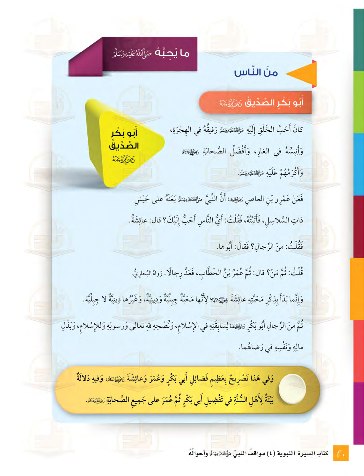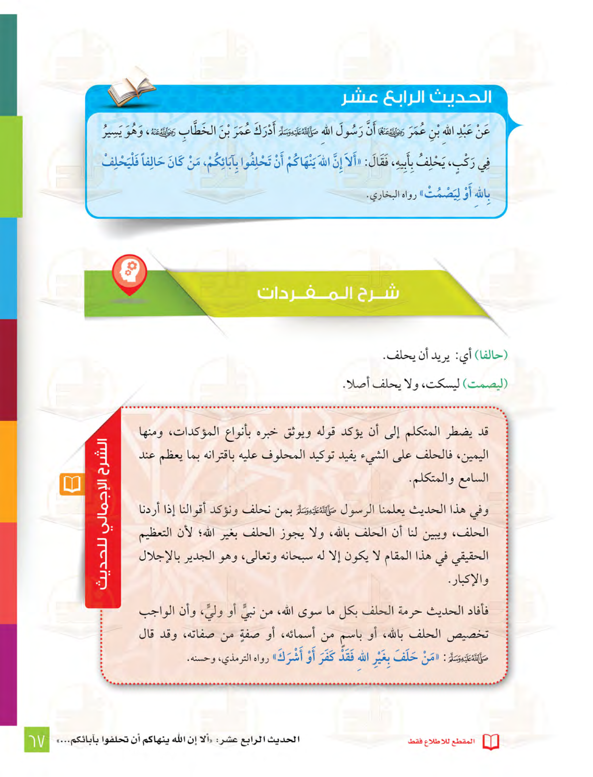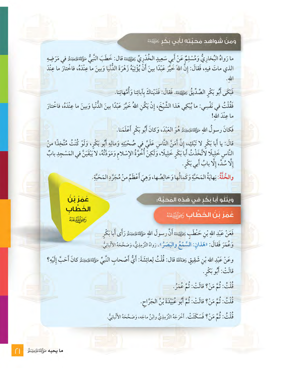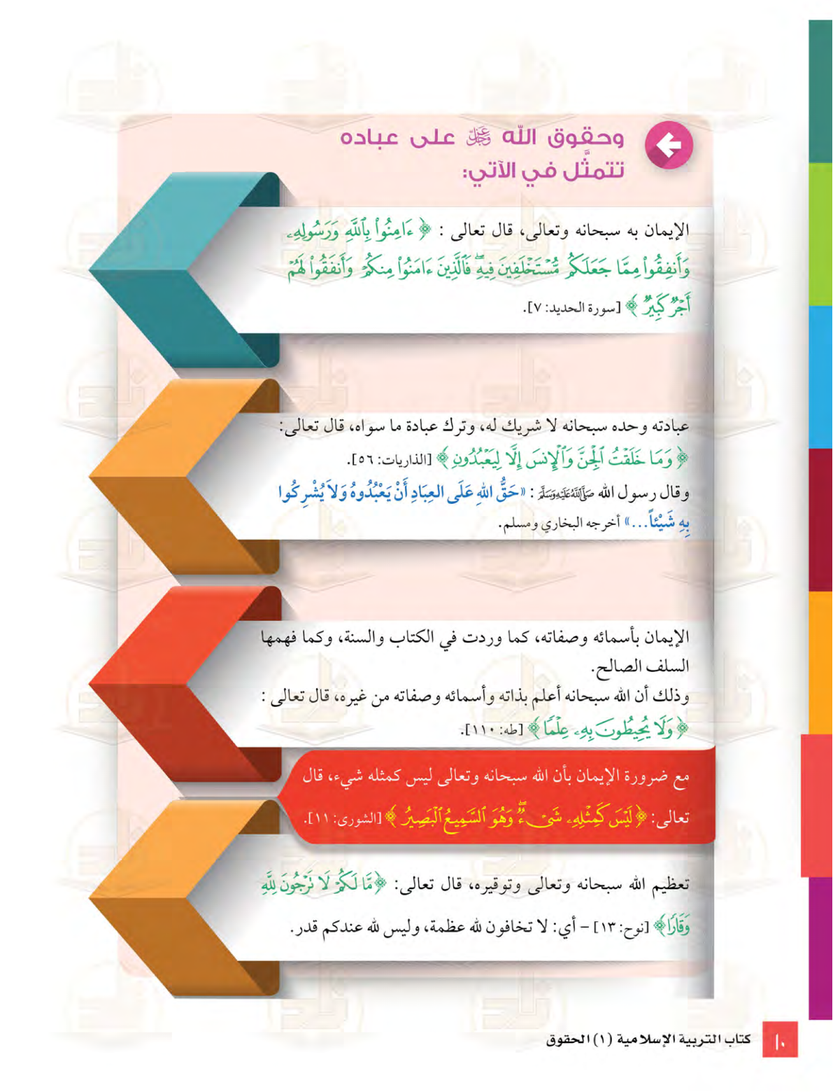 - من كتاب التربية الإسلامية: أبوابا متنوعة في الثقافة الإسلامية، بدءا بكتاب الحقوق، يبين فيه حق الله تعالى ثم حق النبي صلى الله عليه وسلم، ثم حق الصحابة رضي الله عنهم، ثم حق الوالدين ثم حق الزوج والزوجة