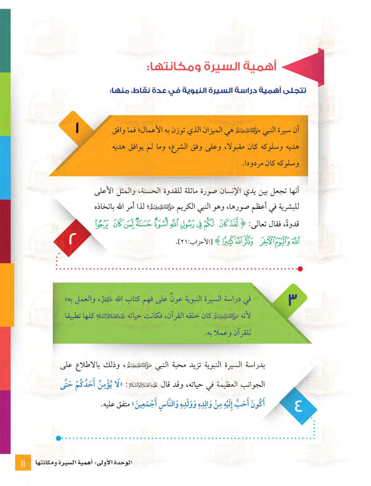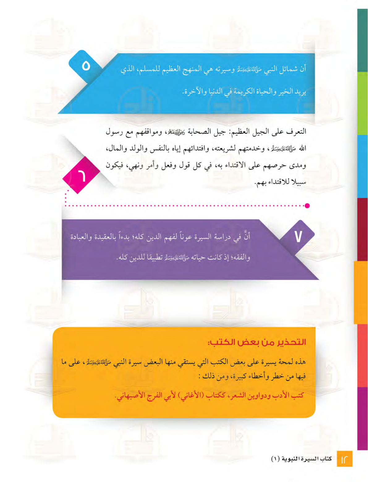 - من كتاب السيرة: التعاملات النبوية، وهي مادة شيقة للغاية، يدرس فيها الطالب تعاملات النبي صلى الله عليه وسلم مع زوجاته وأقاربه وجيرانه والنساء والخدم والفقراء والأغنياء وأصحاب العاهات والمسلمين الجدد، وغير المسلمين، والعصاة والمذنبين، وكبار السِّن وصغار السِّن، يسلك فيها سرد الأثر من كتب السنة كما هو، مع إضافة بعض الفوائد الأدبية أو الفقهية أو العقدية