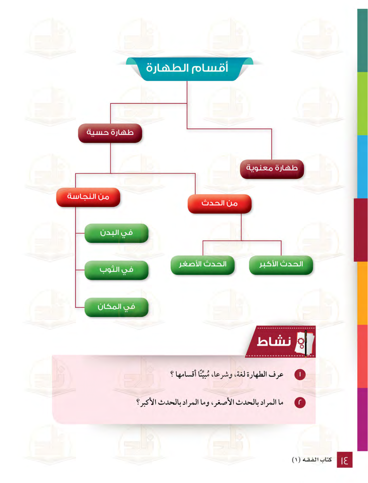 - من كتاب الفقه: الطهارة كاملا، ثم جزءا كبيرا من كتاب الصلاة، مع ذكر أهم المسائل المعاصرة المتعلقة بهذين البابين، بشكل إبداعي حديث