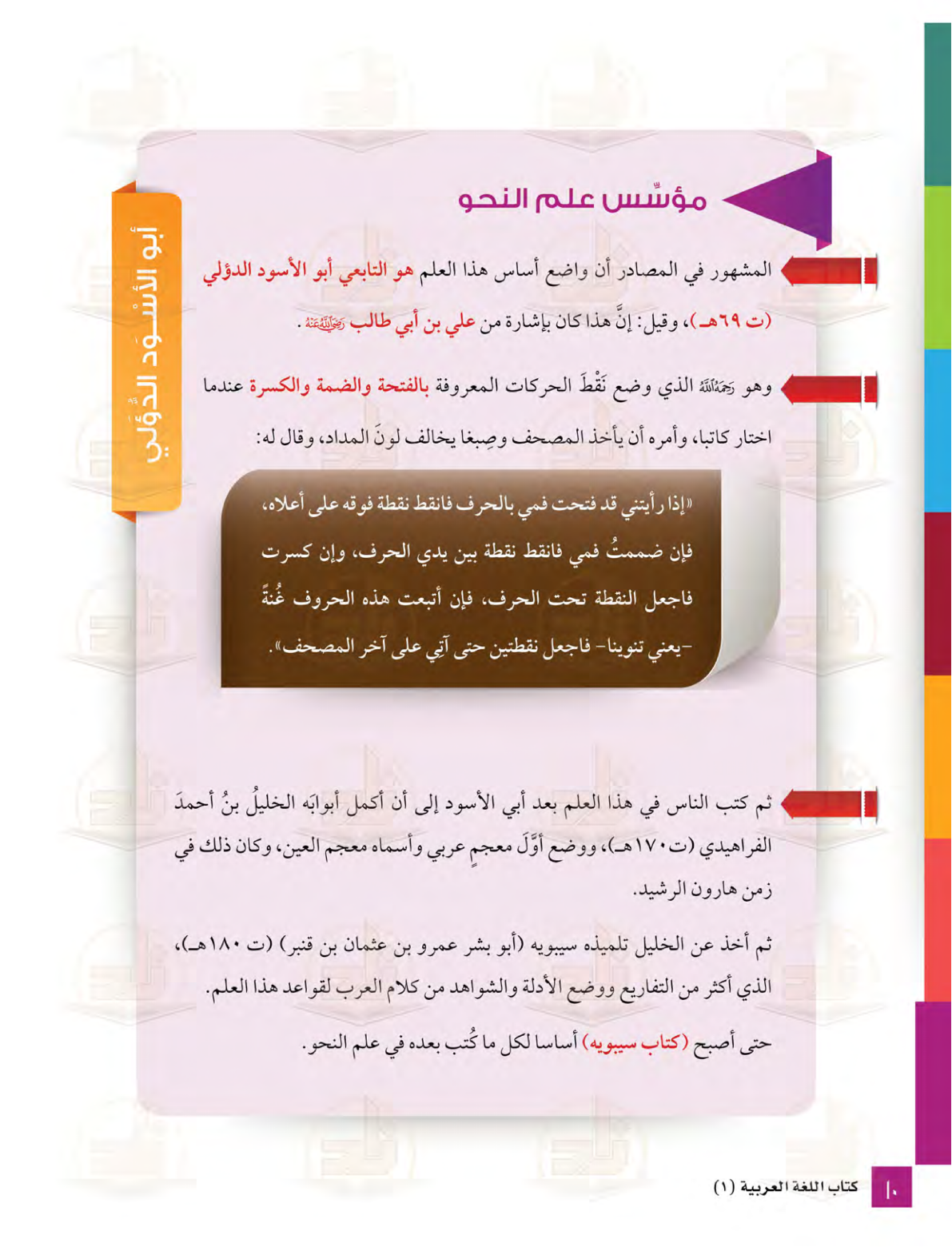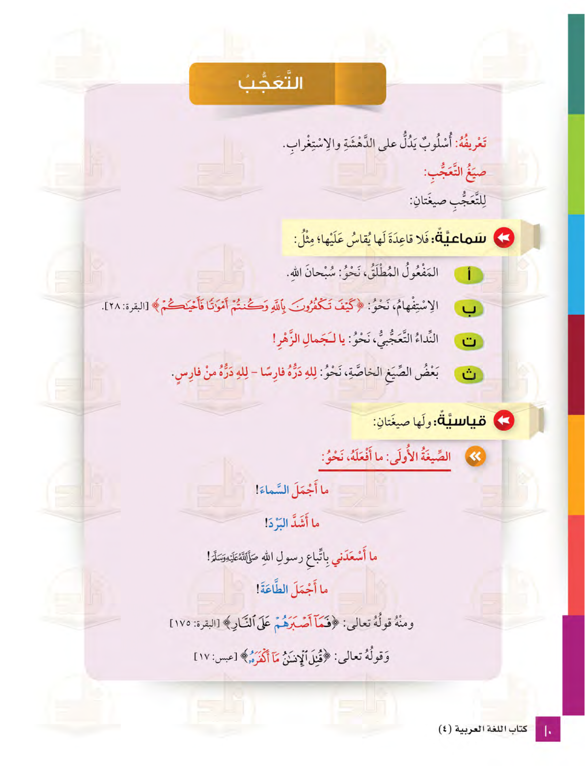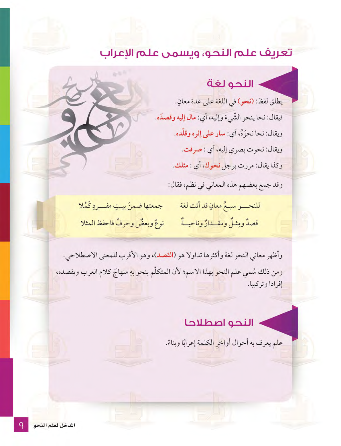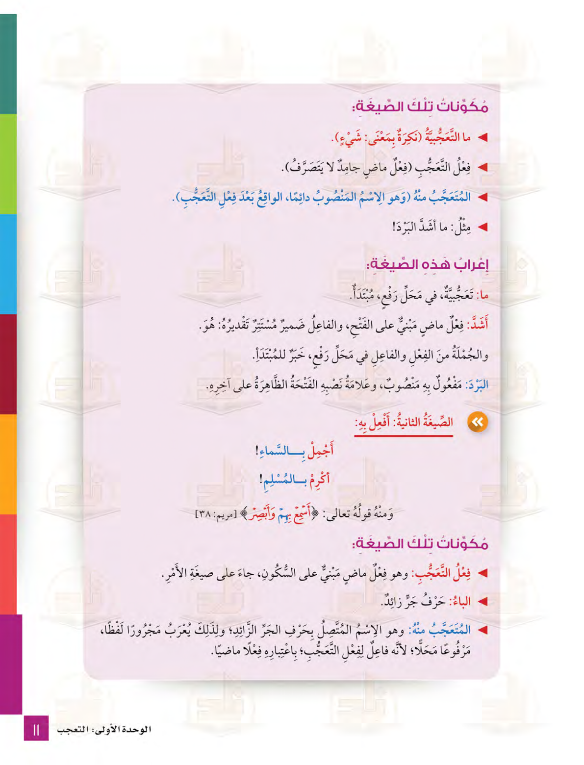 - من كتاب اللغة العربية: أبوابًا من أبوابِ علم النحو، بدءًا بالتعجُّب، واسمِ التفضيلِ، وألفاظِ المدحِ والذمِّ والتوابعِ، والنداءِ وإعرابِ المضارعِ، وأسلوبِ الشَّرطِ وأدواتهِ