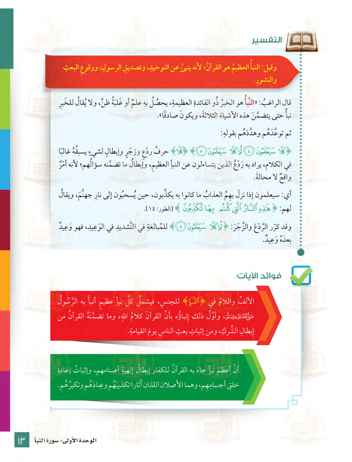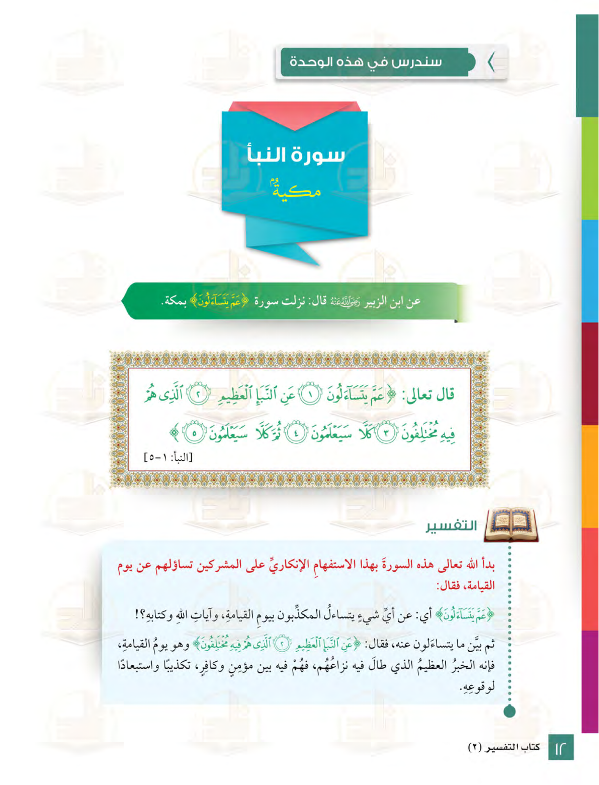 - من كتاب التفسير: عددا من سور جزء عم: سورة النبأ والنازعات وعبس والتكوير والانفطار والمطففين، مع ذكر أهم فوائد الآيات والأحكام المتعلقة بهذه الآيات