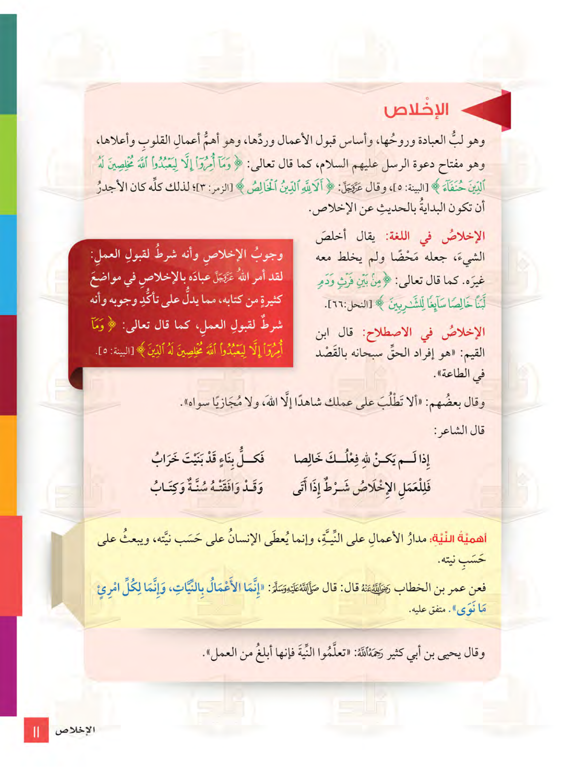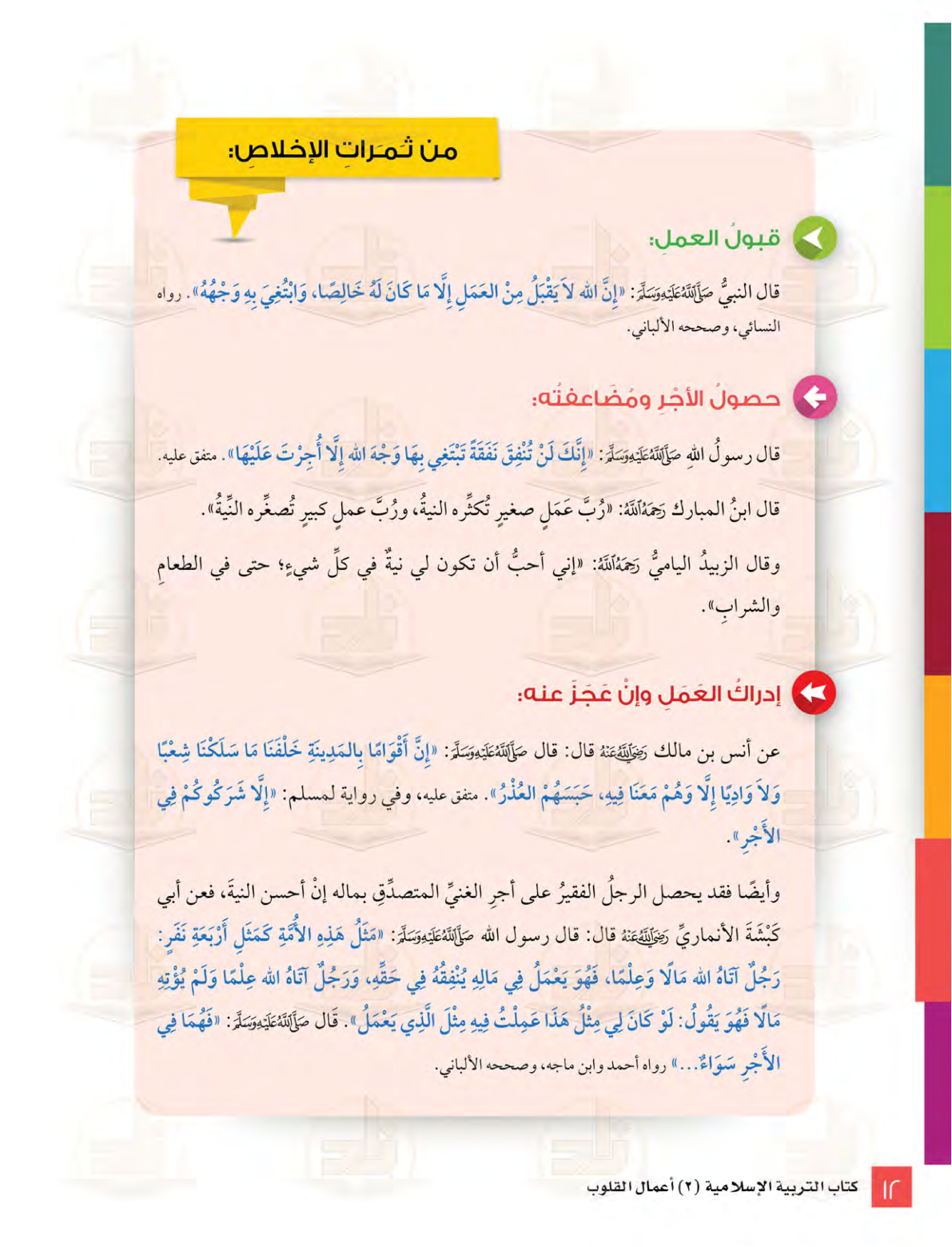 - من كتاب التربية الإسلامية: (أعمال القلوب) بدءا بالإخلاص، وهو لب الأعمال ومفتاحها، ثم التقوى والخوف والرجاء والتوكل والشكر والتفكر والمحبة والصبر، إلى غيره من تلك الأعمال الجليلة، التي تقوي صلة العبد بربه