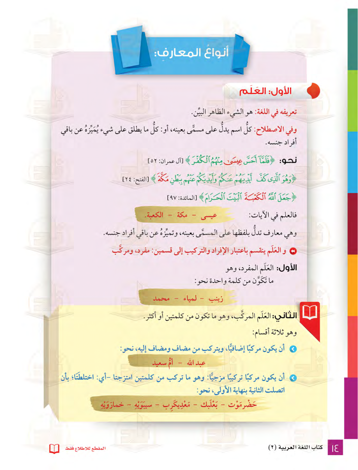 - من كتاب اللغة العربية: النكرة والمعرفة وأسماء الإشارة والأسماء الموصولة، والمبتدأ والخبر والنواسخ: كان وأخواتها وإن وأخواتها ولا النافية للجنس، والحروف التي تشبه ليس، وأفعال القلوب والتصيير .. إلخ