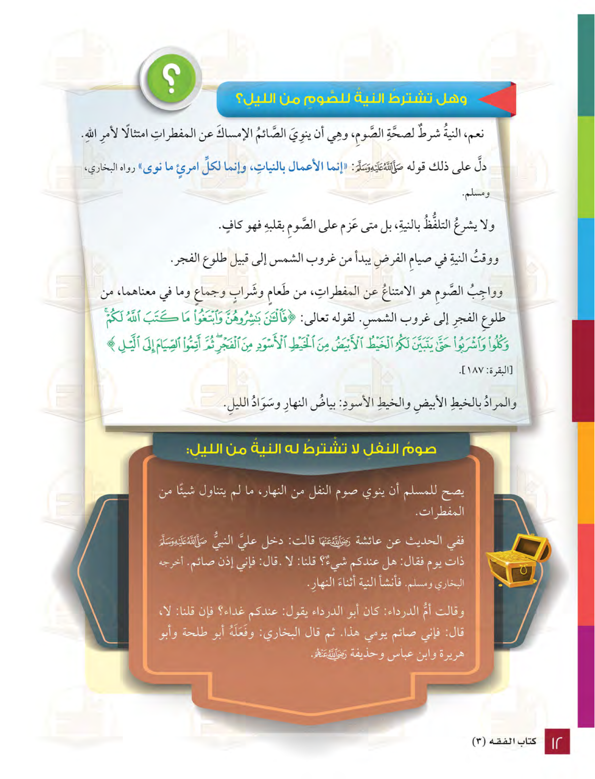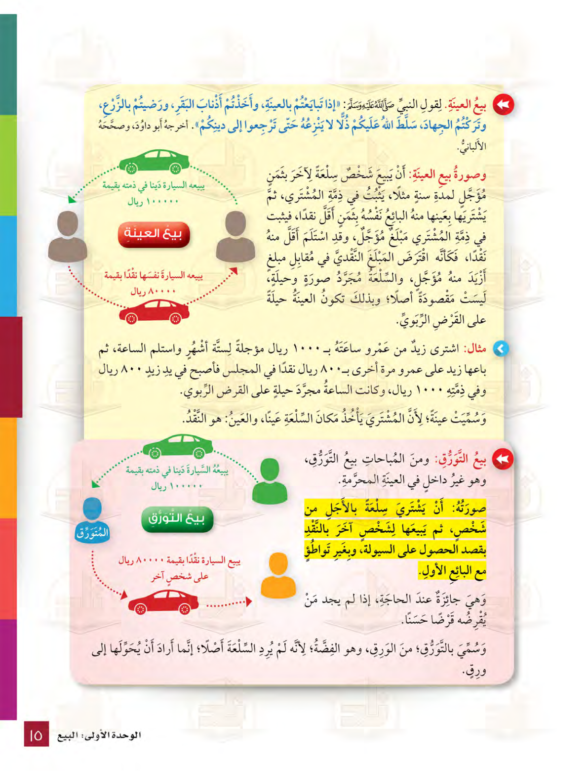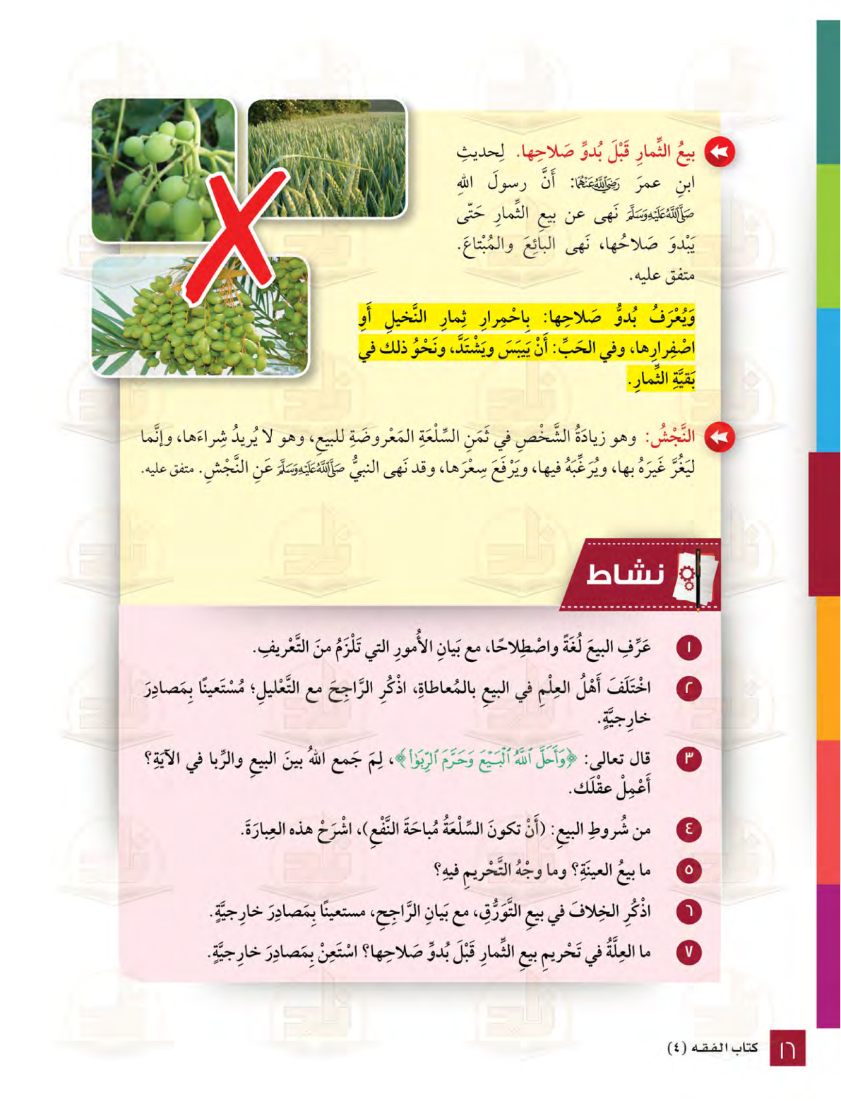 - من كتاب الفقه: طرفًا من المعاملات المالية، كالبيع والإجارة، والأصول التي يدور عليها التحريم، كالربا والغرر والغش، وصوره المعاصرة، مع بيان أهمِّ المسائلِ الماليةِ المعاصرةِ، وأهمِّ مسائلَ فقهِ الأُسْرة، كالنكاحِ والطلاقِ، ثم المرور على الأَيْمانِ والنذورِ، وينتهي المنهجُ بدراسةِ بعض أصولِ وضوابطَ في الأشربةِ والأطعمةِ