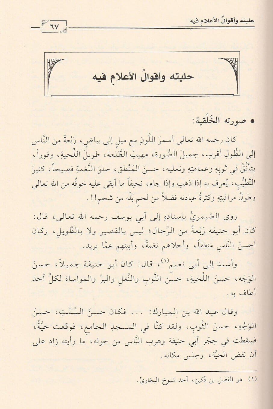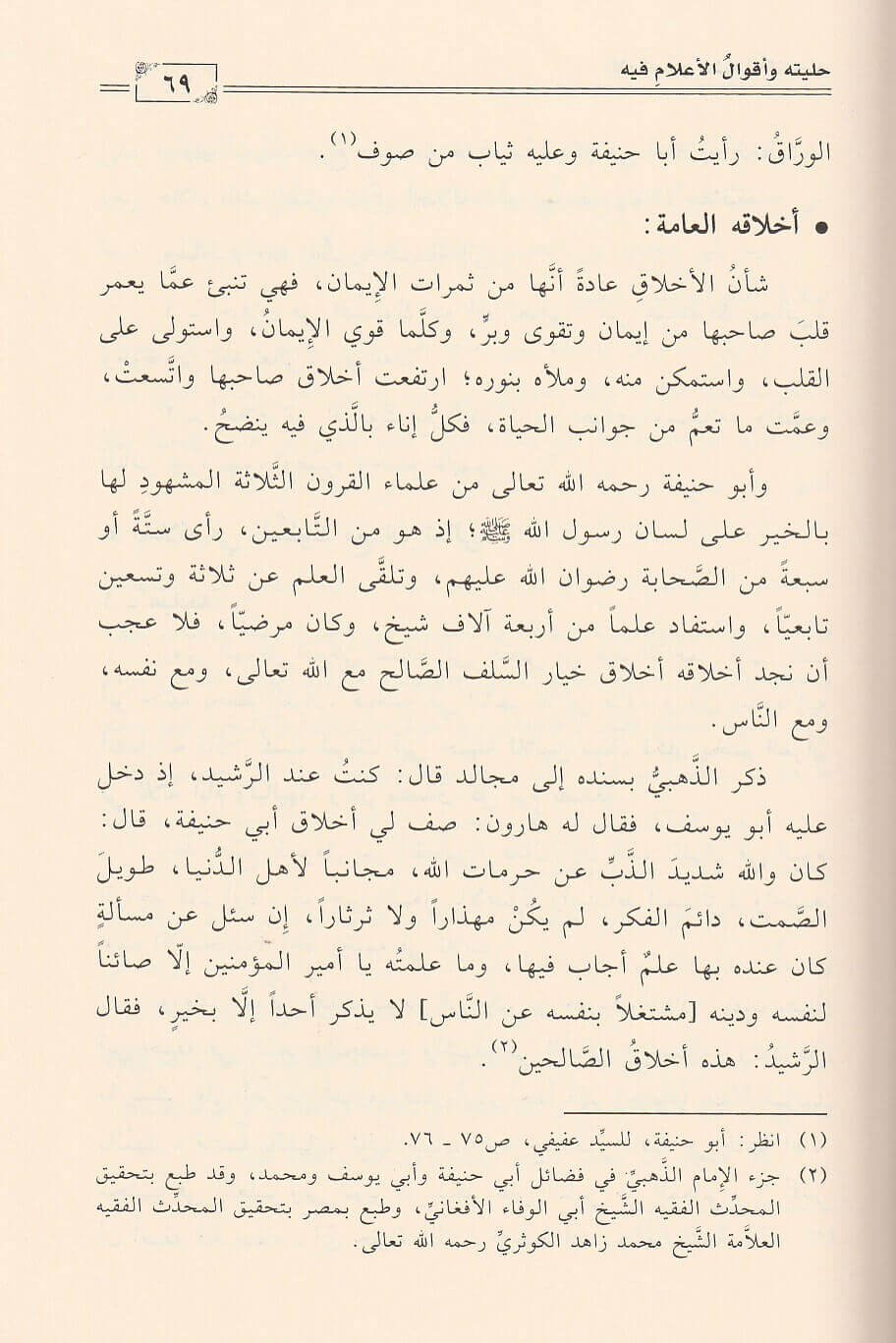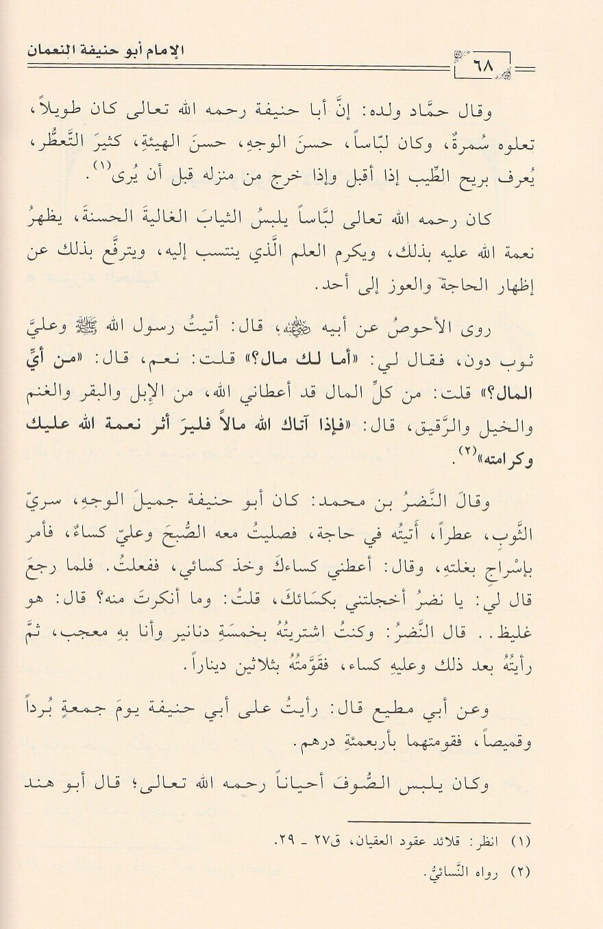 عالم جهبذا ورعا في سره ومؤمنا في يقينه موحدا في سعيه فكان لا يخاف في الله لومة لائم: كم من ضرب بالسياط لينؤ عن حد الله وشرعه وحكمه. وهو اول من انشأ الاجماع فقد كانت له حلقة علمية تضم اعاظم علماء العصر فاقام المجامع الفقهية فلم يتفرد برائيه الفقهي وانما اقام الشورى في كل جوانب علمه. فكانت حلقاته تجمع 40 رجلا من رجال العلم في الفروع المختلفة فيطرحون مسالة لم يرد بها دليل صريح ويتداولون فيها الاراء والادلة حتى يصلوا الى حكم واحد ونتيجة متحدة ثم يسجلونها ليقراها الناس فما احسنها من طريقة وما اقربها الى الصواب. فهو امام الفقهاء ونبراس عظيم ونور جليل لمن اراد السير على درب العلم والهدى. نترك القارئ ليجلس في مجالس حياة الامام ابو حنيفة ليزداد يقينا : كنتم خير امة اخرجت للناس وانا على اثارهم لمهتدون