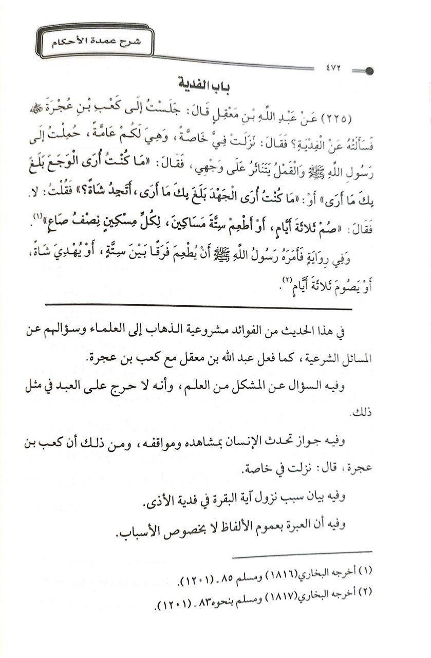 شرح عمدة الأحكام: قال الشارِح – حفظه الله -: «فإن كتاب عُمدة الأحكام لعبد الغني المقدسي – رحمه الله – جمعَ فيه المُؤلِّفُ أحاديثَ الأحكام من الأحاديث المتفق عليها التي رواها البخاري ومسلم إلا في مواطن يسيرة انفردَ أحدُهما بها سنُنبِّه عليها – بإذن الله تعالى -، وسنتحدَّث عن الكتابِ بحديثٍ مُختصرٍ؛ بحيث نُبيِّن مرادَ المُؤلِّف، وما الذي قصدَه المُؤلِّف بعباراته؟ ولن نتوسَّع في ذكر الخلافِ وأدلة كل قولٍ، وقد يُشار إلى القول الراجح في بعض المسائل وذلك من أجل أن يستفيدَ طالبُ العلمِ كيف يفهم مراد المؤلف بحيث إذا استقلَّ الطالبُ بنفسه تمكَّن من فهم مراد المؤلف».