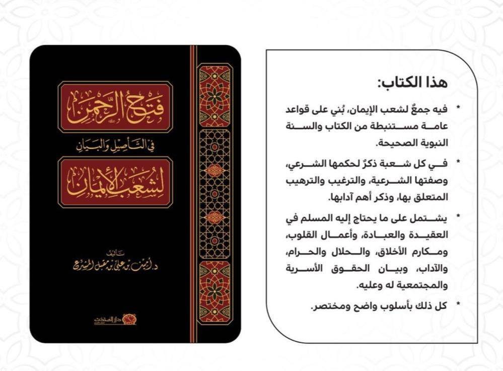 • فيه جمعٌ لشعب الإيمان، بُني على قواعد عامة مستنبطة من الكتاب والسنة النبوية الصحيحة.
